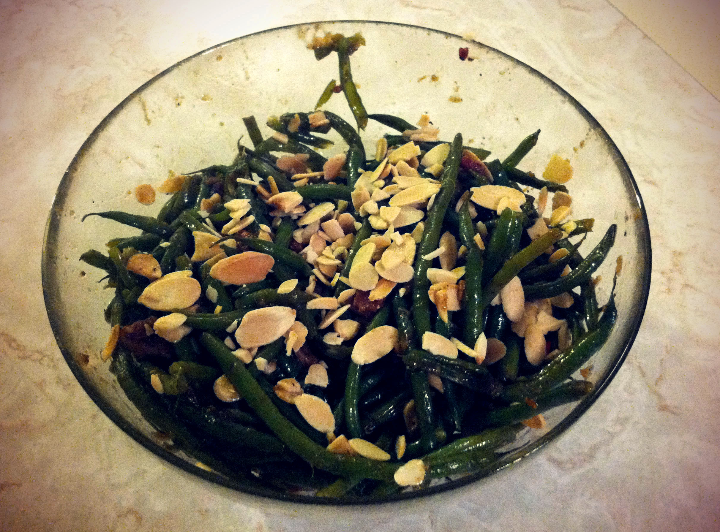 The summer after I graduated from college I worked in northern France for 2 months in a town located near the city of Compiègne. While there, I visited the archaeological site of Pincevent where remains of a Magdalenian campsite used around 10,000-9000 BC was discovered. The remains of stone tools, reindeer bones, hearths and circular structures (thought to be tents) have been found there. The French archaeological team working made lunch for the group of visitors the day I was there and cooked a green bean dish which was the best green bean dish I’ve ever had: haricot verts (the longer and thinner French green beans) that had been sauteed in olive oil and had bacon, onions, and toasted almonds. So simple, yet so delicious.