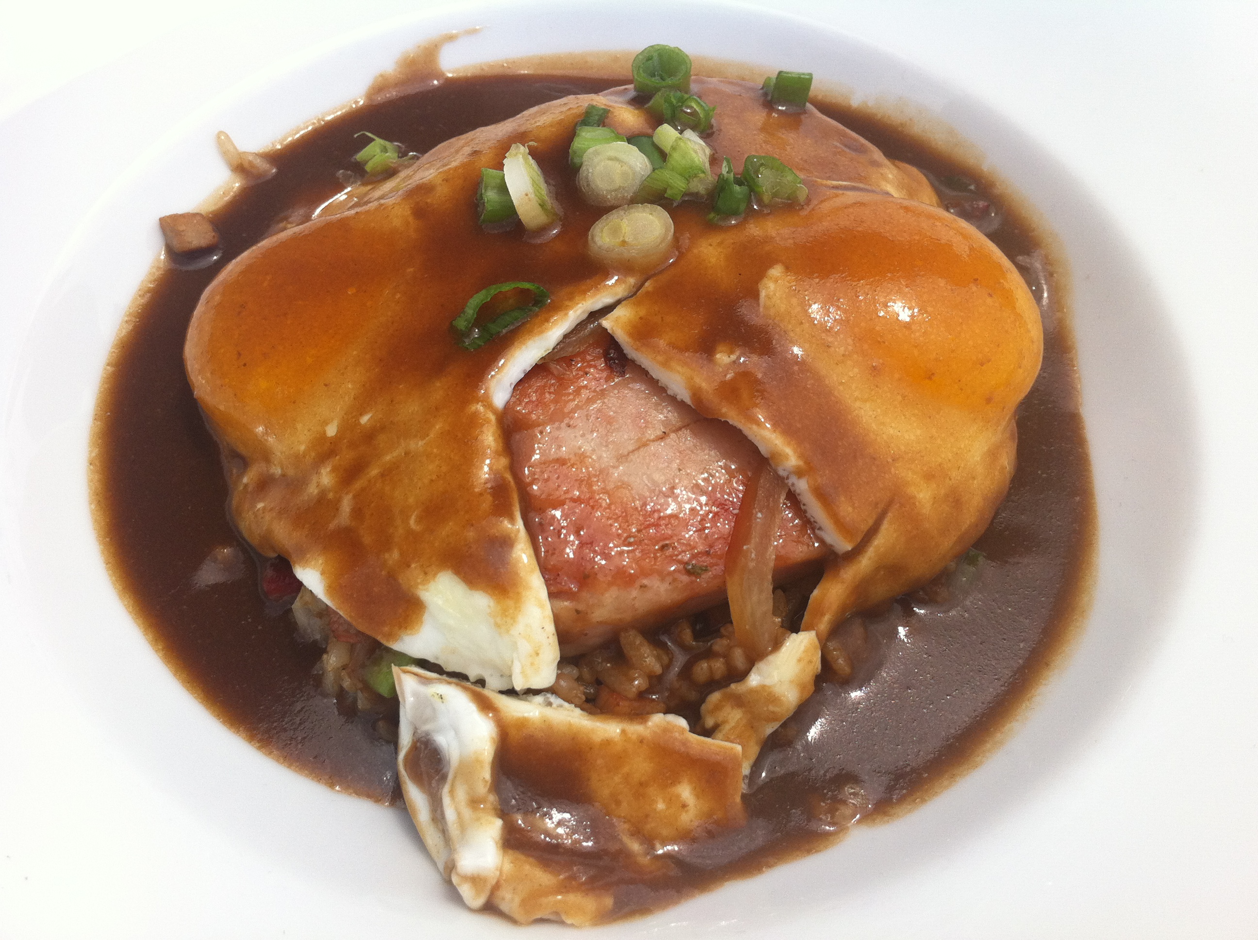 I didn’t have any during my very brief visit to Hilo (well I actually just drove through Hilo and never stopped) at either of the places that claim to have invented it, but I did get to try it at Sam Choy’s Kai Lanai in Kona. At Sam Choy’s you have the option of ordering the loco moco the traditional way with a hamburger patty, or you can order it with pork, fish, or meatless.