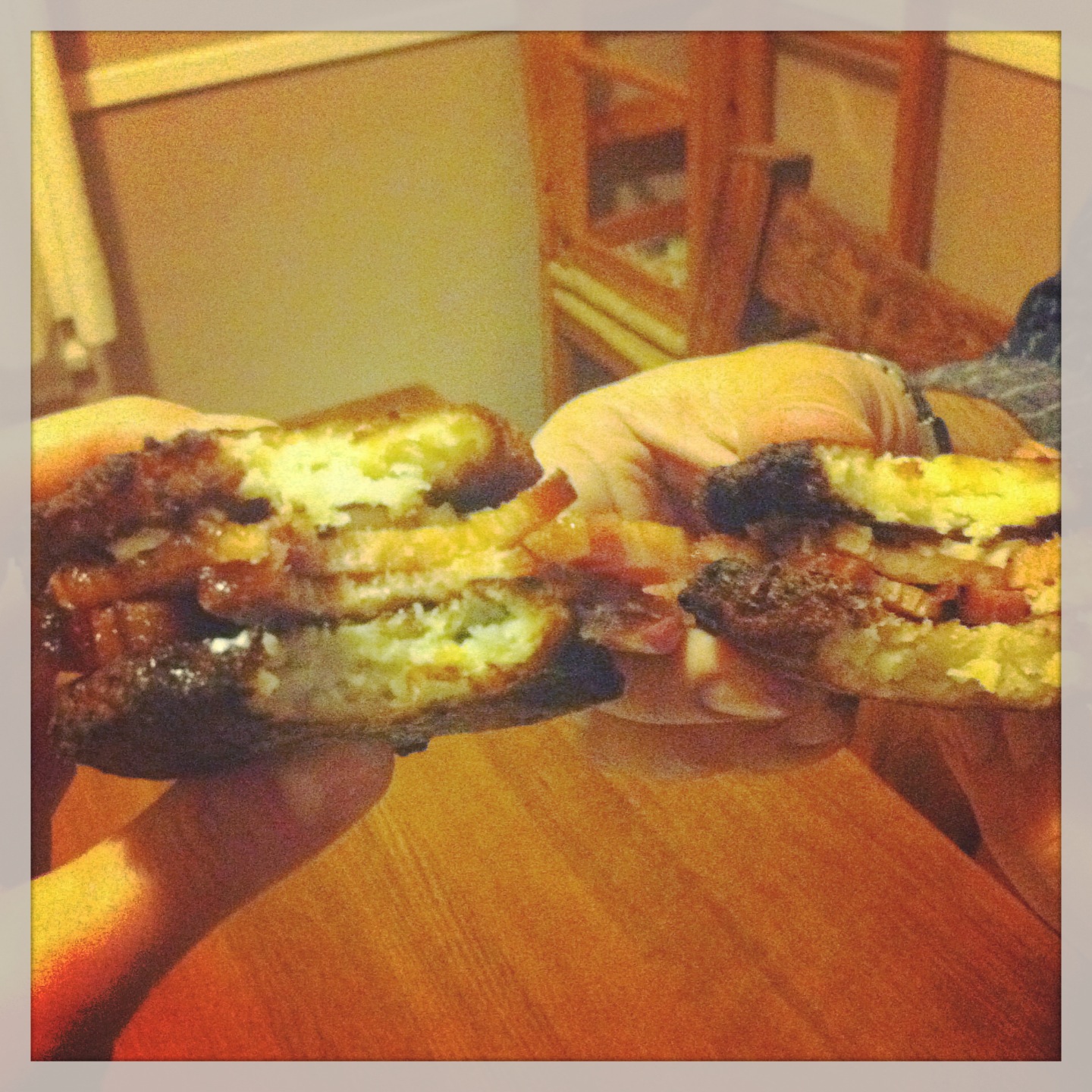 Now I know that placing a pork product inside a sandwich created in time for Hanukkah (we actually made ours during Hanukkah) and written up in the Jewish Journal is probably sacrilegious, but just go with me on this. The Latke Double Down is based on KFC’s Double Down, a sandwich where the bread is replaced with fried chicken breasts. The Latke Double Down uses latkes as the bread of the sandwich. The Jewish Journal put lox and sour cream in their double down, instead of KFC’s bacon and cheese, and the Sandwich Monday team decided to use brisket. But I, of course, thought it would taste even better with bacon.